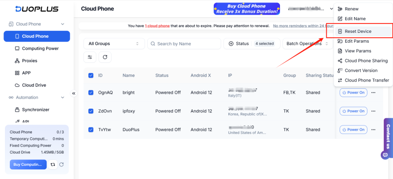 Based on different functional characteristics, DuoPlus Cloud Mobile has integrated the functions of bulk operations, optimizing the bulk operation dropdown menu, helping users quickly and conveniently find the corresponding functions during use, and supporting users in bulk proxy configuration and bulk proxy DNS switch settings.