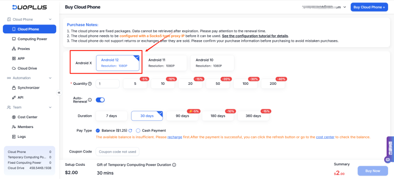 O DuoPlus manteve uma atualização na configuração da versão Android 12, com as impressões digitais do cloud phone da versão Android 12 mais realistas, reduzindo efetivamente os riscos de controle de segurança. A resolução também foi aumentada de 720p para 1080p, proporcionando aos usuários uma experiência visual mais clara.